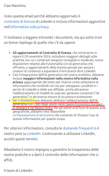 I received an email on October 9, 2024 from LinkedIn with information about updates to the license agreeement and privacy policy, made necessary following the implementation and use of *generative AI* or, as I jokingly call it, *DeGenerative AI*. You can find here the FAQs related to LinkedIn and Generative AI.
