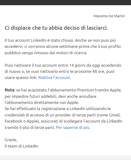 LinkedIn offers the possibility to reactivate the account within 48 hours via a link or within 14 days by logging back in again.